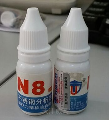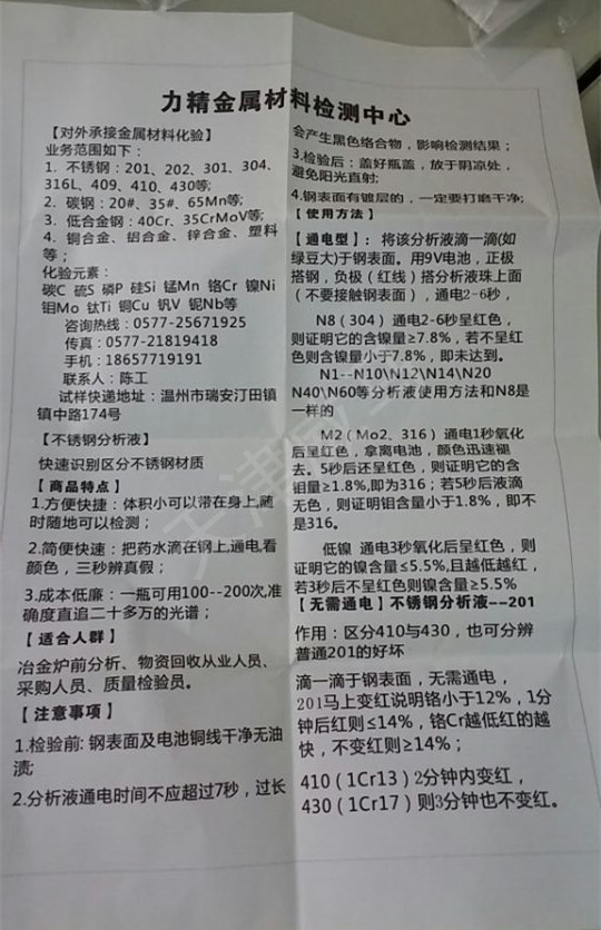 2.使用時:滴一小滴于不銹鋼表面,用9V電池,正搭鋼,負(fù)搭測定液珠上面,通電要迅速,紅色一出現(xiàn)立即停止通電(如果通電時間過長會產(chǎn)生黑色絡(luò)合物,影響檢測結(jié)果)