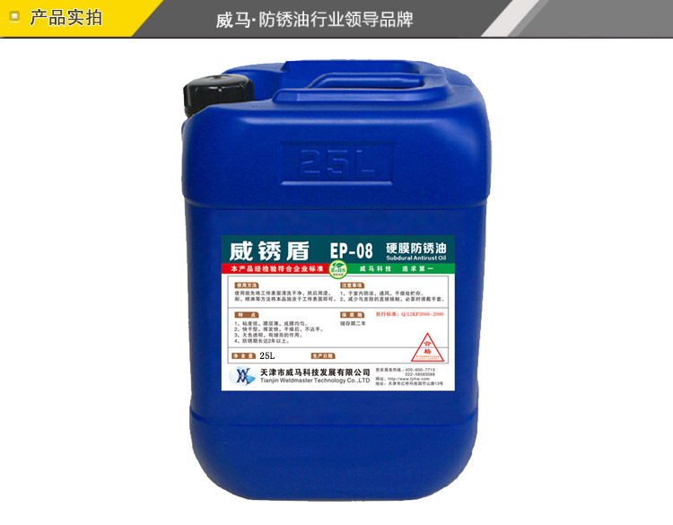 威銹盾EP-08硬膜防銹油是一種無色透明低粘度液體防銹專用品,以樹脂為成膜材料,加入高分子防銹添加劑并用精致石油溶劑配成的防銹油。本品在金屬表面成膜迅速、油膜堅(jiān)固、透明而均勻,決不沾手,有良好的耐磨耐熱性能,防銹時(shí)間持久。可在各種環(huán)境下長期保存不銹蝕。本品使用簡便,設(shè)備簡單,刷、浸、噴均可,不遮蓋器件原色,并有增光作用。EP-08硬膜防銹油為本公司的招牌產(chǎn)品,公司引進(jìn)國外先進(jìn)專利配方和生產(chǎn)工藝,研制開發(fā)出的新一代硬膜防銹油。經(jīng)測試,可以替代進(jìn)口同類產(chǎn)品,歡迎測試,選購。